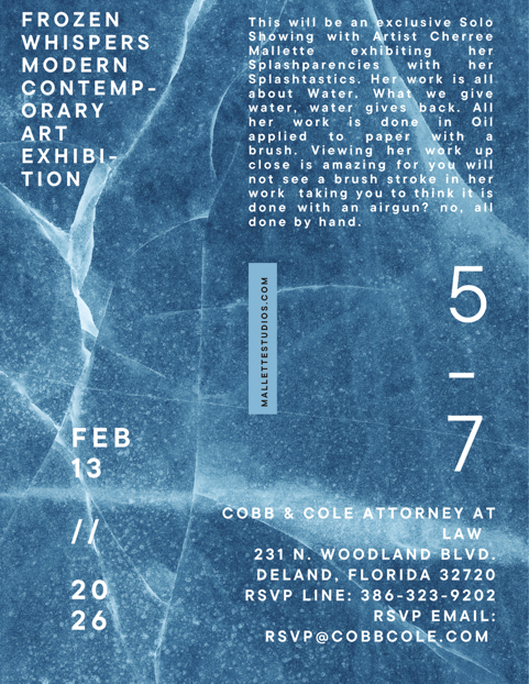 This will be an exclusive Solo Showing with Artist Cherree Mallette exhibiting her Splashaprenics with her Splashastics. Her work is all about Water. What we give water, water gives back. All her work is done in Oil applied to paper with brush. Viewing her work up close is amazing for you will not see a brush stroke in her work taking you to think it is done with an airgun? no, all done by hand.
