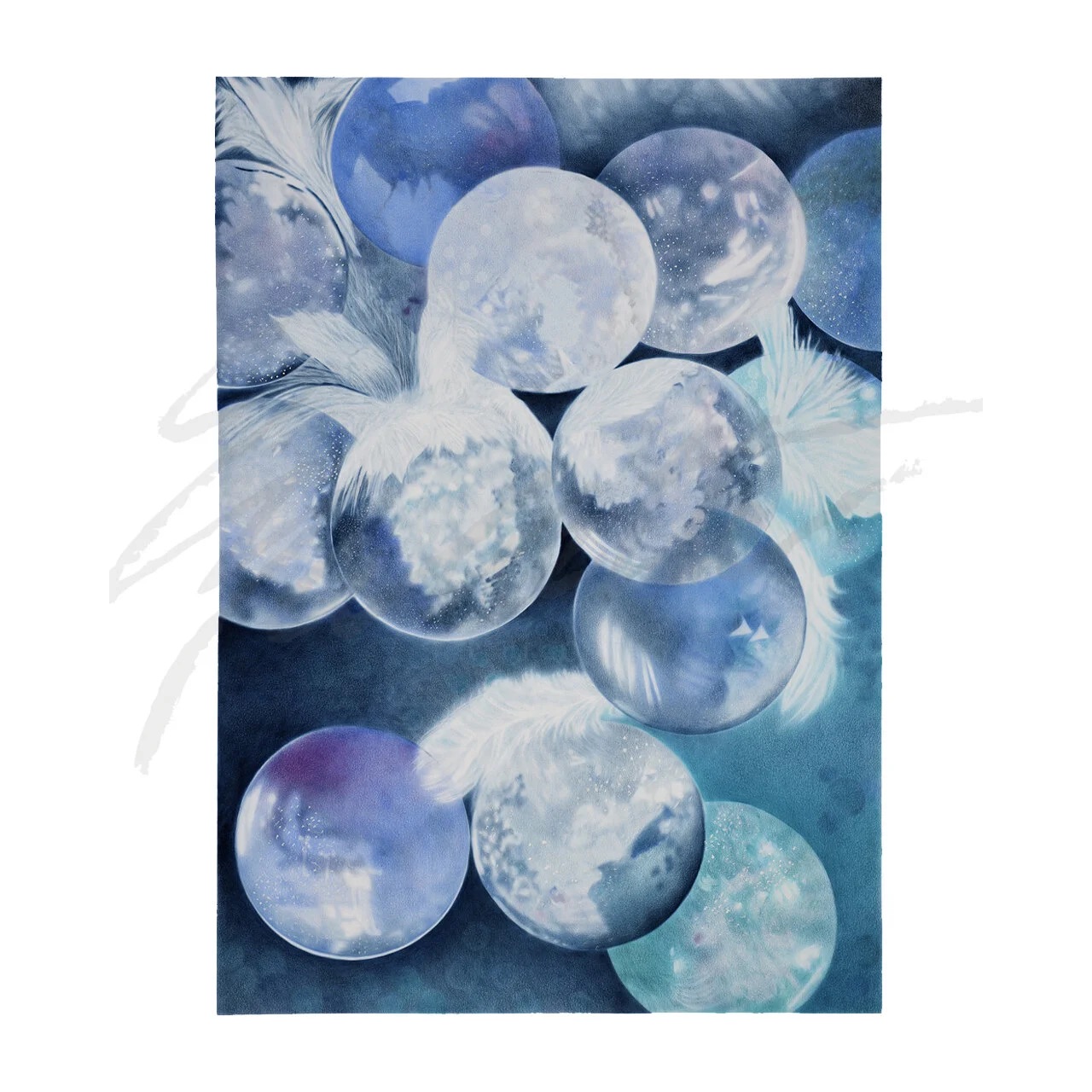 Frozen in Love presents a quiet interplay of light, texture, and form. Translucent spheres float weightlessly against a dark, nebulous field, their surfaces capturing soft reflections and revealing subtle, cloud-like interiors. Delicate white feathers drift among them, enhancing the sense of fragility and calm. The cool palette of blues, whites, and hints of purple creates a dreamy, celestial mood that invites contemplation of stillness and ephemeral beauty. Inspired by the delicate perfection of ice bubbles in winter air, the work highlights the fragile balance between solid and fleeting, capturing the way nature suspends moments of quiet wonder.