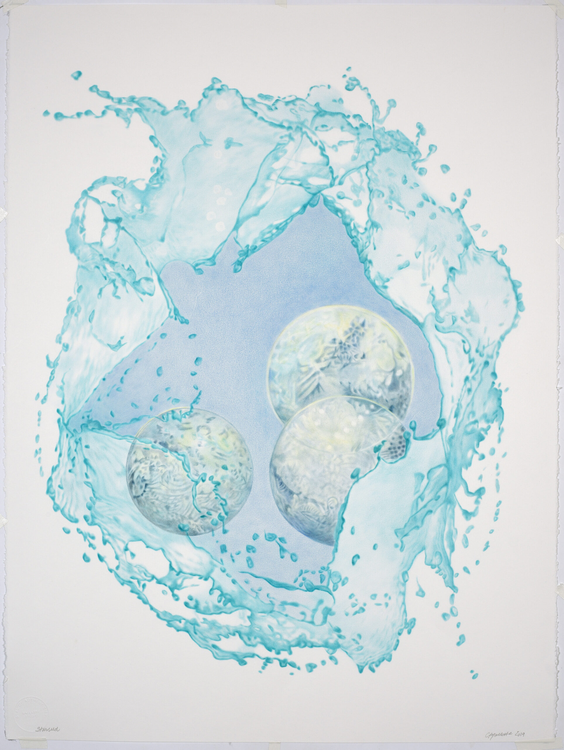 Starseed features three detailed spheres in white and grey, contrasted by a dynamic splash of translucent aqua-blue liquid. Light and shadow emphasize water’s clarity and motion against a white background, inviting reflection on water’s vital role in life through a blend of stillness and movement. The spheres appear to float upward into another dimension, symbolizing the journey of a Star Seed on Earth—drifting through the Universe, gathering insights and sharing new perspectives with beings below. It’s a vision of life as a wonderful, interconnected experience.