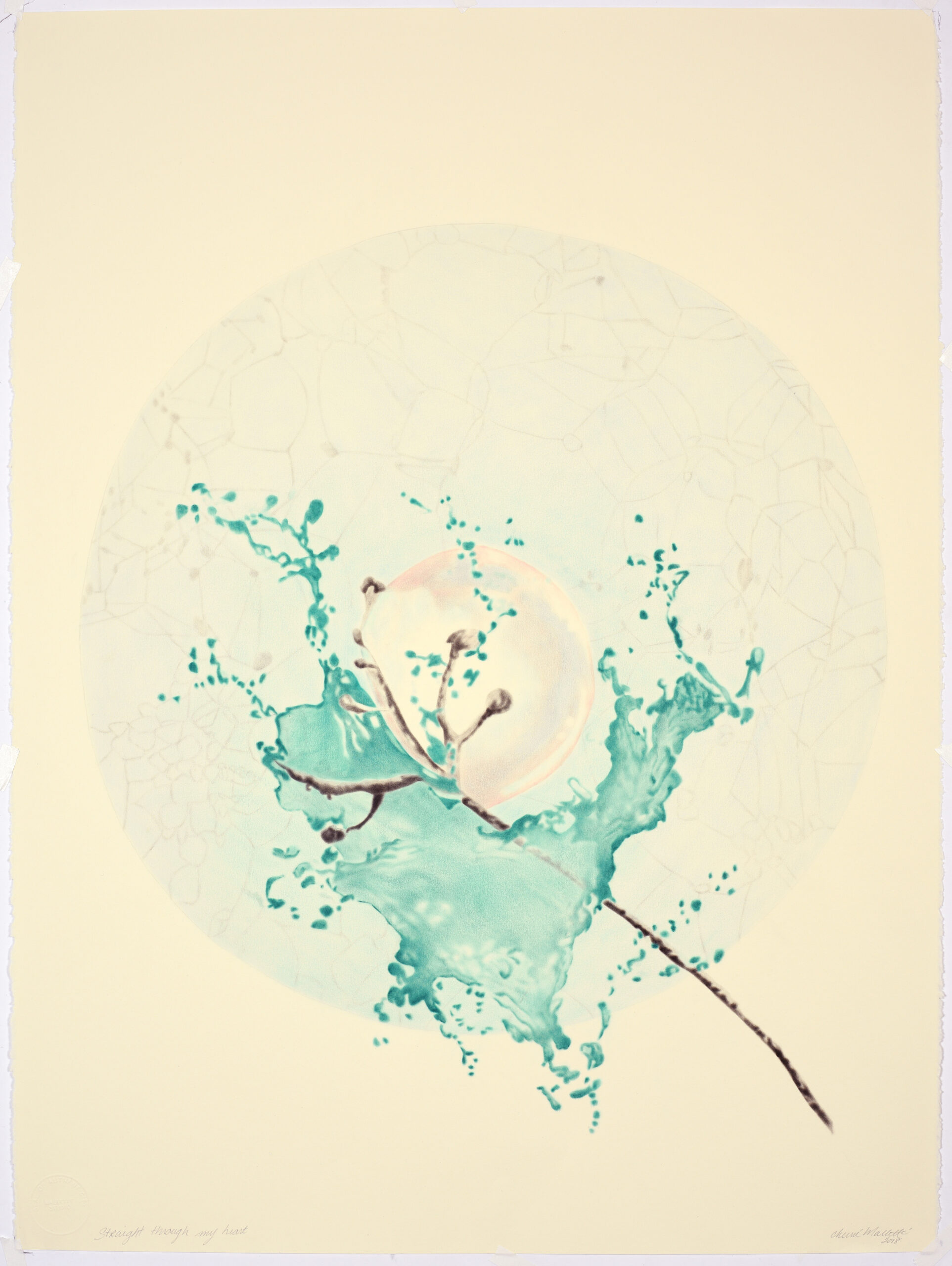 Centered within a subtle circular frame, this piece captures a sudden burst of turquoise-blue fluid, its energy radiating outward like a heartbeat made visible. Fine, brown branches with tender buds’ weave through the splash, grounding the movement in natural growth and fragility. A delicate overlay of geometric patterns in muted tones enhances the sense of layered complexity without overpowering the composition. The choice of oil on ivory-toned paper adds warmth and intimacy, reinforcing the emotional undercurrent tied to themes of heartbreak and healing. Here, fluidity meets structure, and raw emotion is translated into an organic yet abstract form that invites quiet reflection on resilience and renewal.