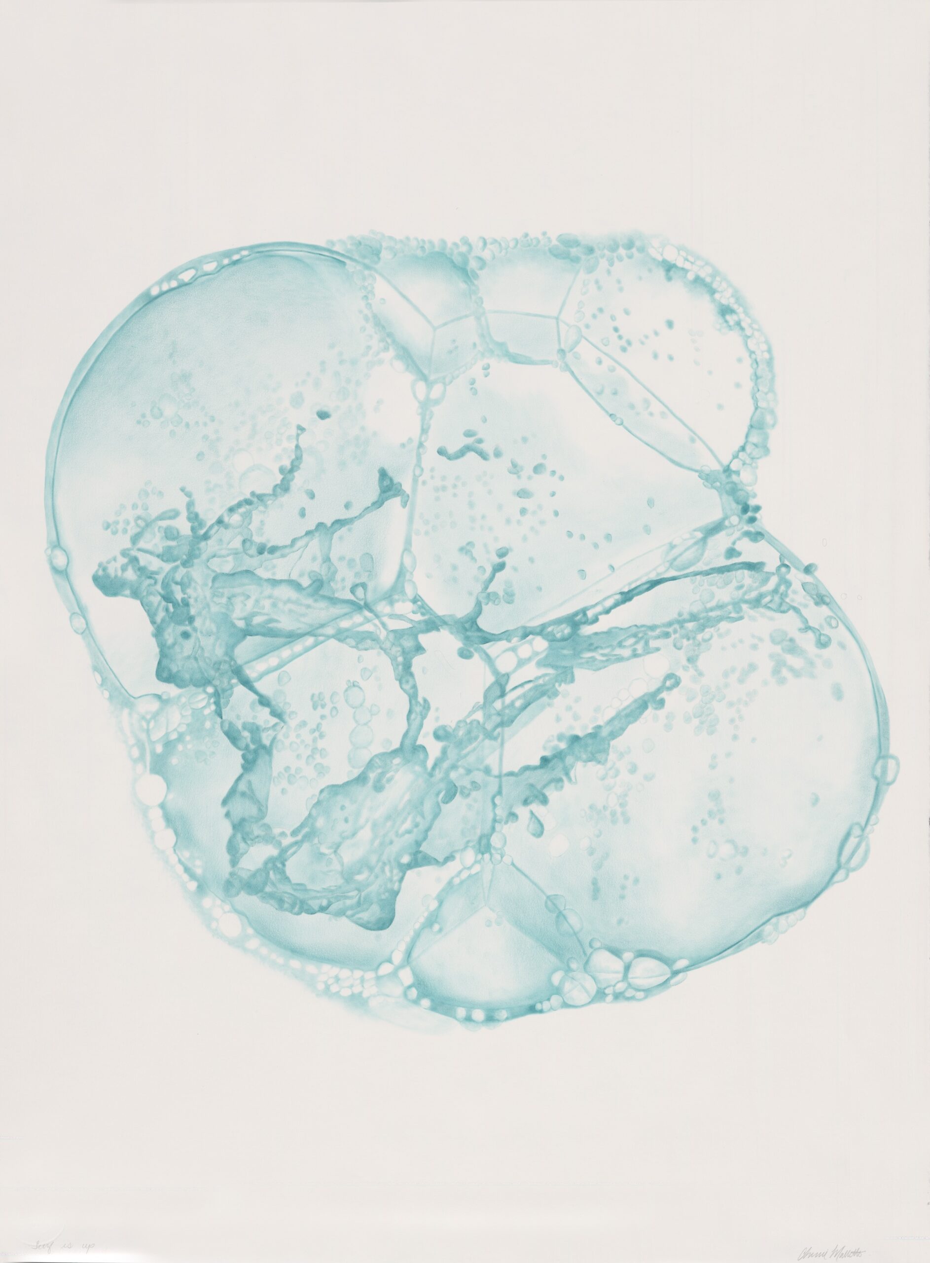 Surfs Up presents a delicate interplay of form and fluidity through a translucent, bubble-like structure rendered in soft turquoise. The composition weaves interconnected rounded shapes with fine, lace-like textures that evoke the fragile surface tension of soap bubbles. Smooth yet irregular edges create an organic rhythm, suggesting movement within a contained space. A neutral background amplifies the ethereal quality, allowing the luminous bubble structures to emerge with clarity and subtle depth. The work explores the dynamic between imagination and natural phenomena, using mirrored images of a water splash to evoke the image of a surfer riding a wave. The soap bubble motif becomes both a visual and conceptual anchor—simultaneously representing the wave’s fragility and the moment’s energy. This careful balance invites viewers to consider themes of reflection, transience, and the fluid boundaries between reality and perception.