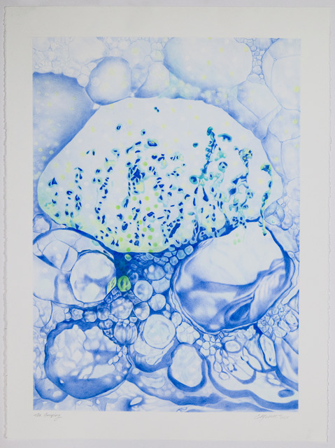 The Grouping presents a quiet study of stones partially submerged in water, where translucent layers and soft shadows reveal their smooth, rounded forms. Shades of blue deepen the sense of stillness, while subtle gradients trace the gentle curves and surfaces of overlapping pebbles. At the center, a distinct oblong stone draws attention with abstract blue and green markings, providing a thoughtful contrast to the otherwise naturalistic depiction. Fine lines and delicate highlights suggest ripples and reflections, capturing the ephemeral interaction between solid matter and flowing water. This composition invites reflection on the passage of time and the stories embedded in simple, often overlooked elements of nature. 30” x 22.5”