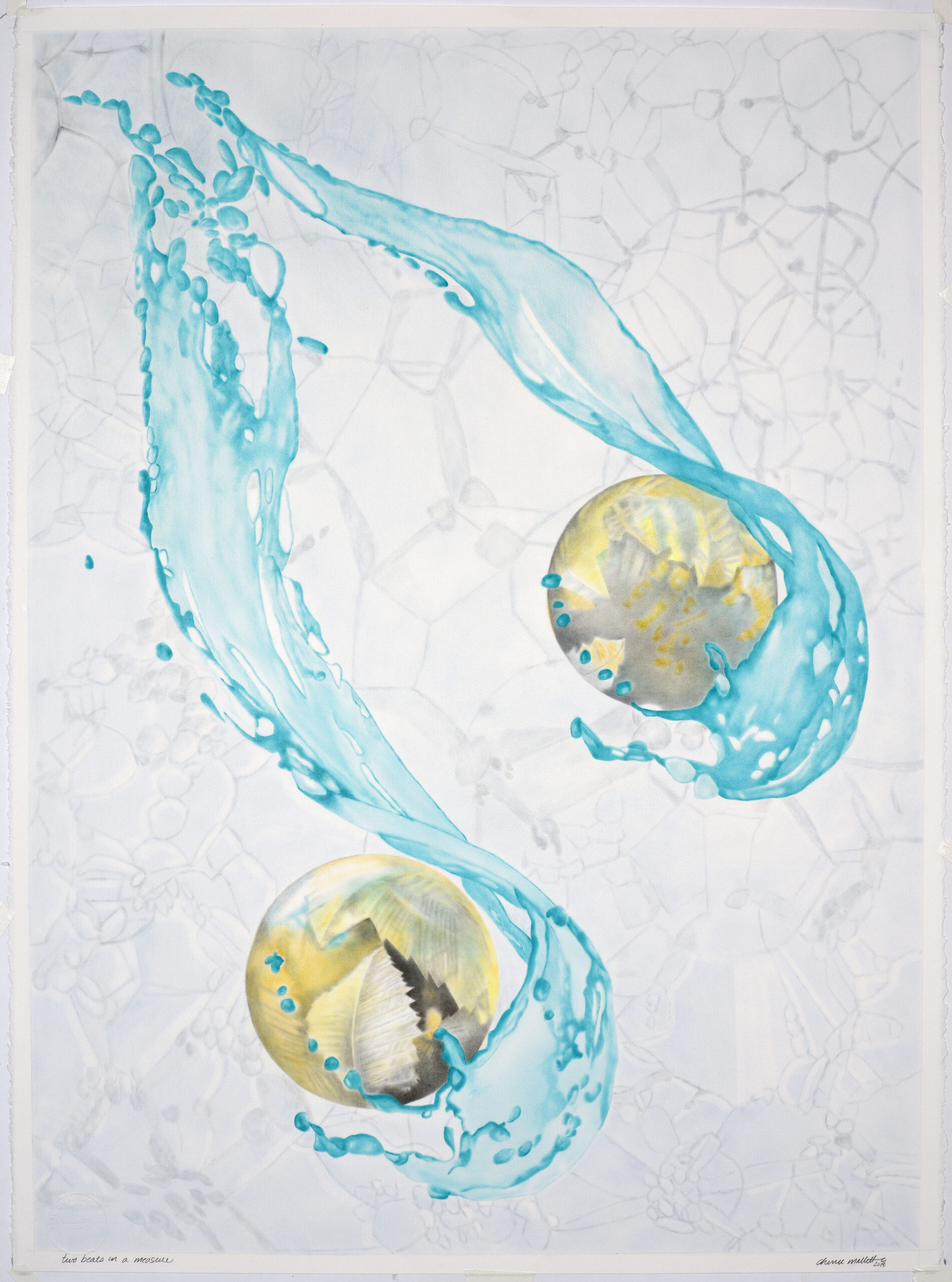 Two Beats to a Measure celebrates the rhythm of life shared with those we love—whether a soulmate, children, or cherished pets. Two golden spheres embrace flowing blue water against a soft, abstract background, symbolizing the harmony of connection and the life-giving, reciprocal nature of love.